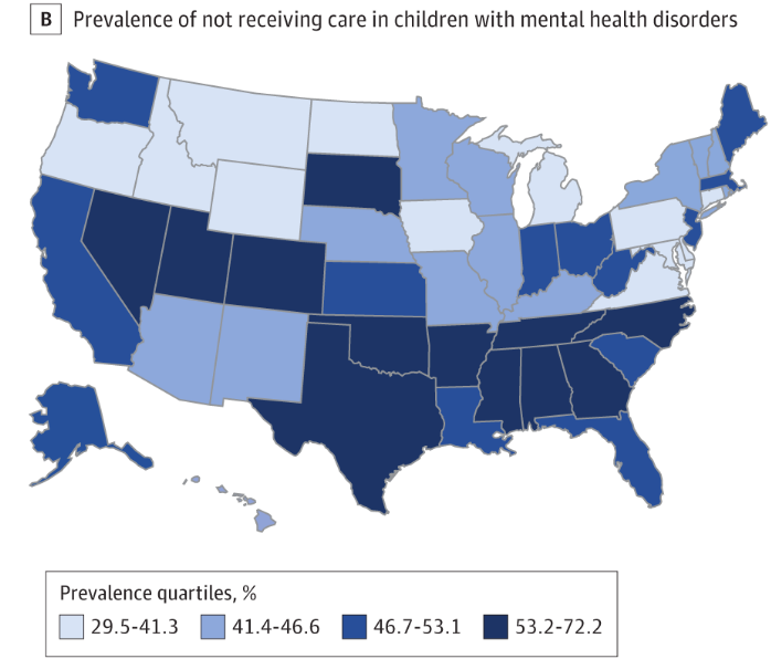 analysis. Researchers used data from a survey of more than 50,000 U.S. parents with children under 18 to come up with national estimates. They estimate that more than 16 percent of children have a mental health condition, but nearly half of didn't receive needed treatment or counseling. That problem was particularly prevalent in certain parts of the country, such as North Carolina, where an estimated 72 percent of children with treatable mental health conditions didn't receive needed care. The researchers say there's a need for policy fixes to boost treatment access.